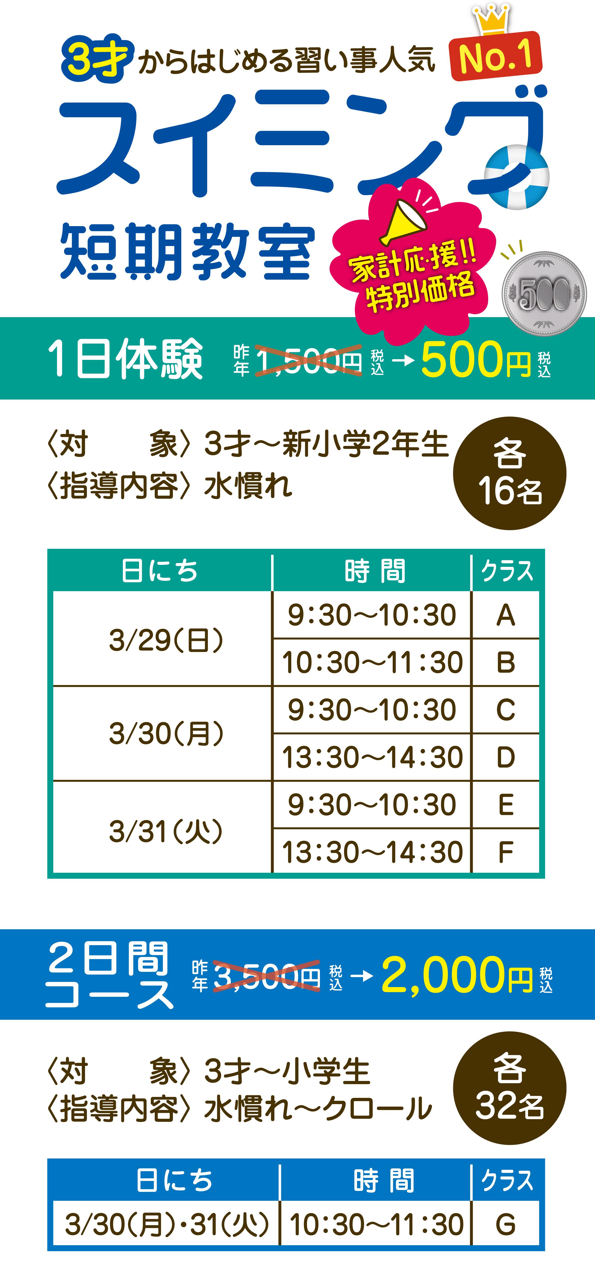 ※スイミング本科生はスイミング短期教室受講対象外です。